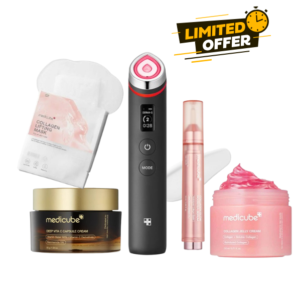 This kit combines the energizing effect of the AGE-R Booster Pro with collagen- and vitamin C–rich formulas. The serum boosts collagen production, the jelly cream deeply hydrates, the vitamin C cream brightens the complexion, and the lifting mask delivers an immediate firming effect.